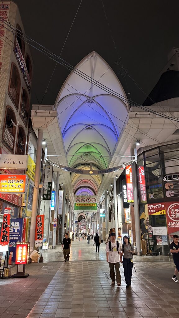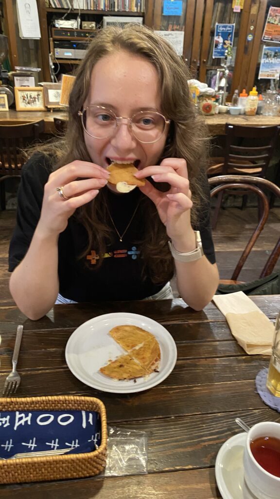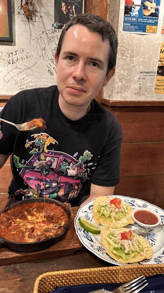 Angekommen in Hiroshima begrüßte uns zum ersten Mal der Regen in unserem Urlaub. Zum Glück konnten wir unsere Koffer schon im Appartement abstellen und mussten diese nicht all zu lange durch den Regen schieben. Nachdem der Regen auch nach ein wenig Schlendern durch die überdachten Einkaufsstraßen nicht aufhören wollte, gingen wir eine Kleinigkeit essen. In der Nähe des Friedensparks gab es ein kleines Restaurant, das sowohl als Musikbar als auch für Tacos und weitere mexikanische Gerichte empfohlen wurde. Vor Ort gab es direkt einen freudigen und positiven Kommentar vom älteren Barbesitzer zu Alonas Ed Sheeran Tour T-Shirt.