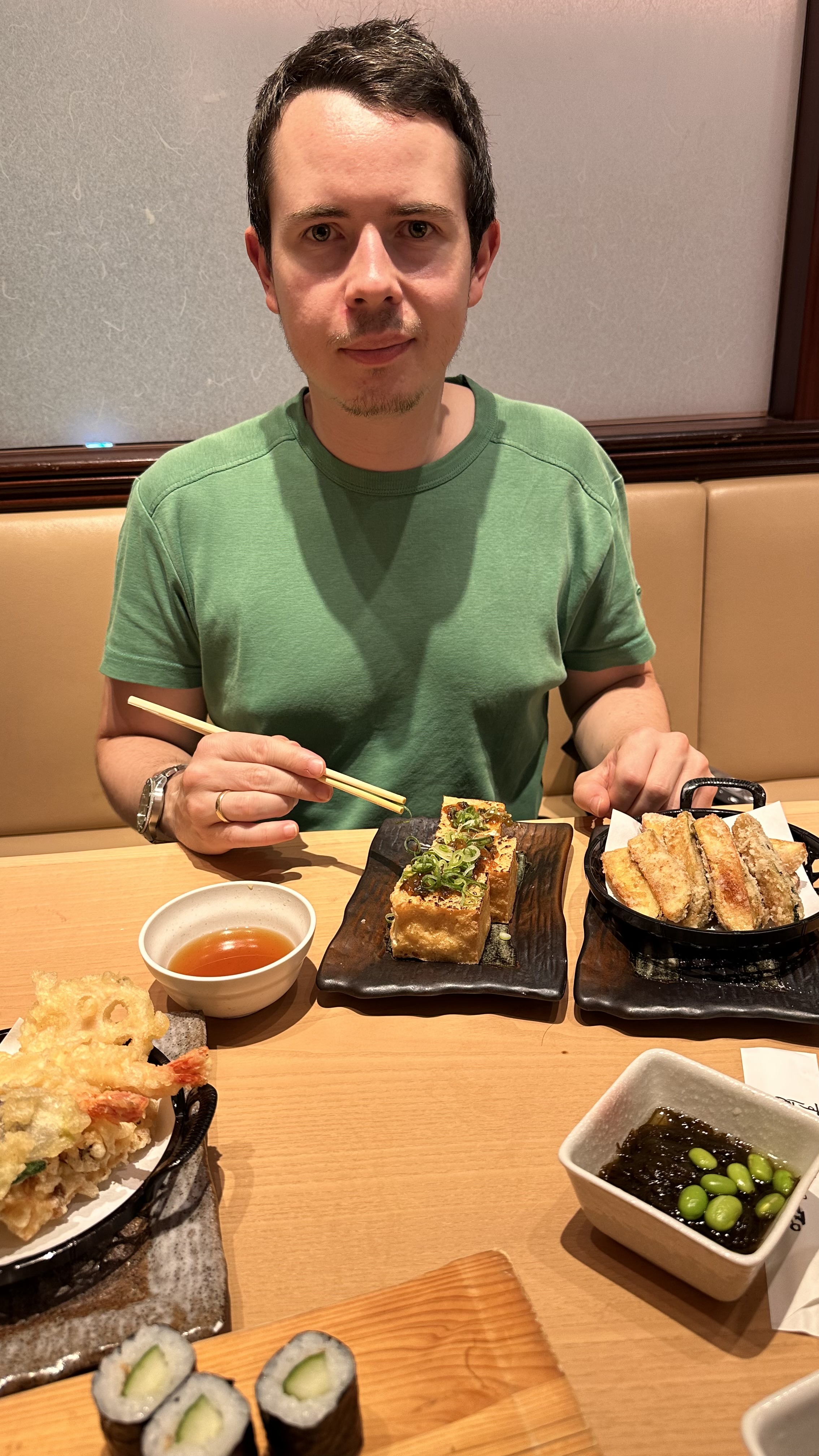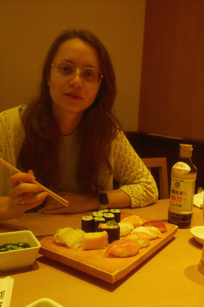 Auf dem Rückweg konnten wir zum Glück einen der letzten Punkte von Alonas Bucket-Liste erledigen: Sushi essen in Japan. Also in einem richtigen Lokal und nicht von einem Konbini oder aus einer Bento-Box. An unserem Umstiegspunkt entdeckten wir ein kleines Izakaya – also eigentlich eine Kneipe – die sowohl Sushi als auch etwas ohne Fisch anbot. Das Sushi war wunderbar (laut Alona) und auch mein frittierter Tofu war gut. Zusätzlich war die Stimmung in dieser Kneipe sehr anders zu dem, wie wir es aus den bisherigen Restaurants kannten. Es war lauter, geselliger und generell sehr entspannt. Ein Gast schien ein wenig zu tief ins Glas geschaut zu haben und fiel immer wieder um – da haben wir uns zu Anfang noch Sorgen gemacht (und auch das Personal vor Ort), aber seine Kollegen haben erklärt, dass das wohl häufiger bei ihm vorkommt.