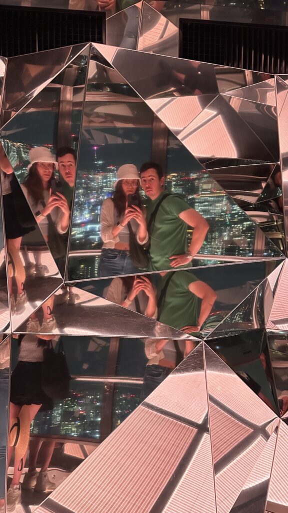 Den eingeplanten Spaziergang am Hafen mussten wir auf den morgigen Vormittag verschieben, denn nach dem Check-In und einem kurzen Frischmacher hieß es wieder hoch hinaus zu kommen. Diesmal stand der Tokio Tower – der Eiffelturm von Tokio – auf dem Programm. Hier hat sich uns eine spektakuläre Aussicht auf das nächtliche Tokio geboten. Seht selbst!