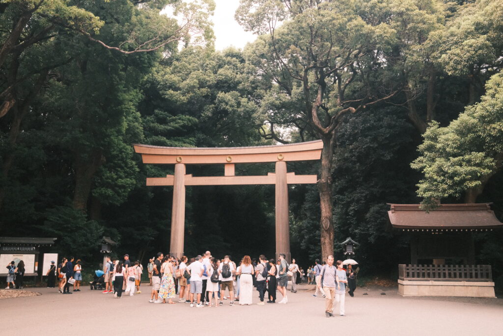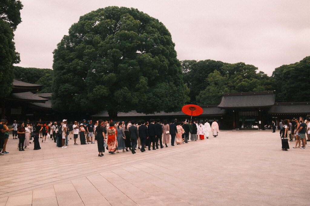 Jetzt genug von vielen Menschen, Zeit für etwas Ruhe. Hier gibt es auch Tempel in der Nähe. Dummerweise ist der Meiji-Schrein auch anderen Touristen bekannt. Trotzdem haben wir uns auf den Weg dorthin gemacht, zu Fuß durch den ganzen Park. Vor Ort konnten wir noch Zeugen einer Hochzeitszeremonie werden. Hier spürt man direkt ein bisschen andere Kultur.