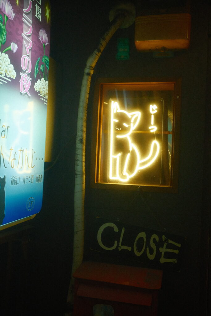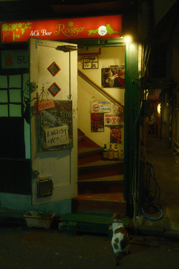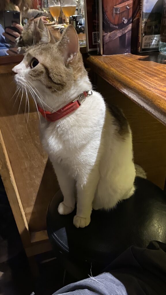 Wieder auf dem Rückweg und eine kleine Stärkung später, suchen wir das Viertel der über 200 kleinen Kneipen auf. Und klein scheint man hier wörtlich zu nehmen, denn mehr als 5 Personen passen hier nicht rein. Verleitet durch die Katzenschilder und eine miauende Person, haben wir uns zufälligerweise für die eine Bar entschieden, die auch Katzen als Servicepersonal beheimatet. So genossen wir japanische Spirituosen – von Bier über Wein bis hin zu köstlichem Sake – inklusive Streicheleinheiten für die vierpfotige Bedienung.