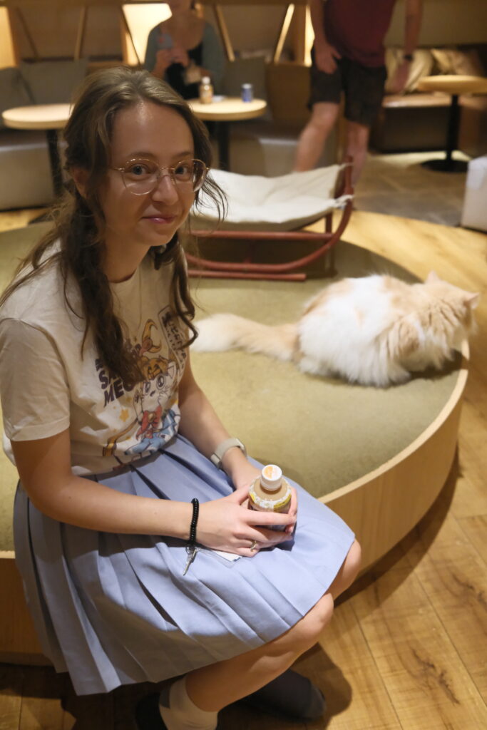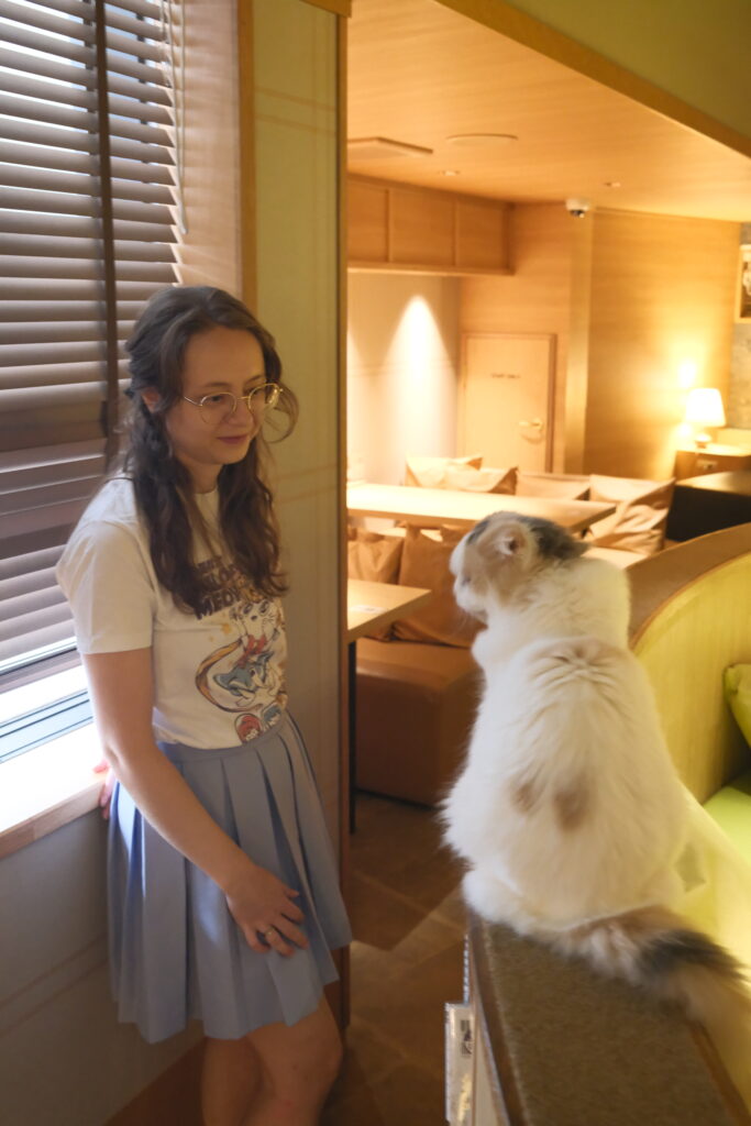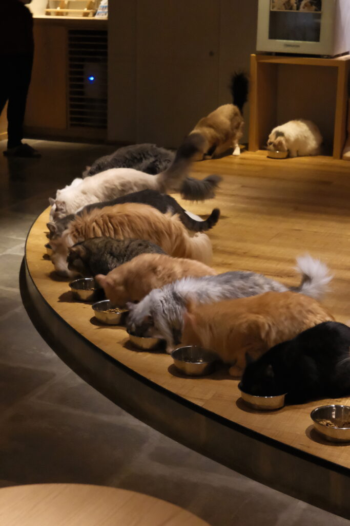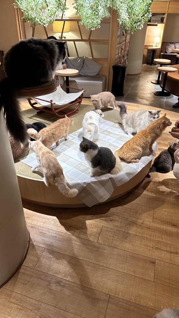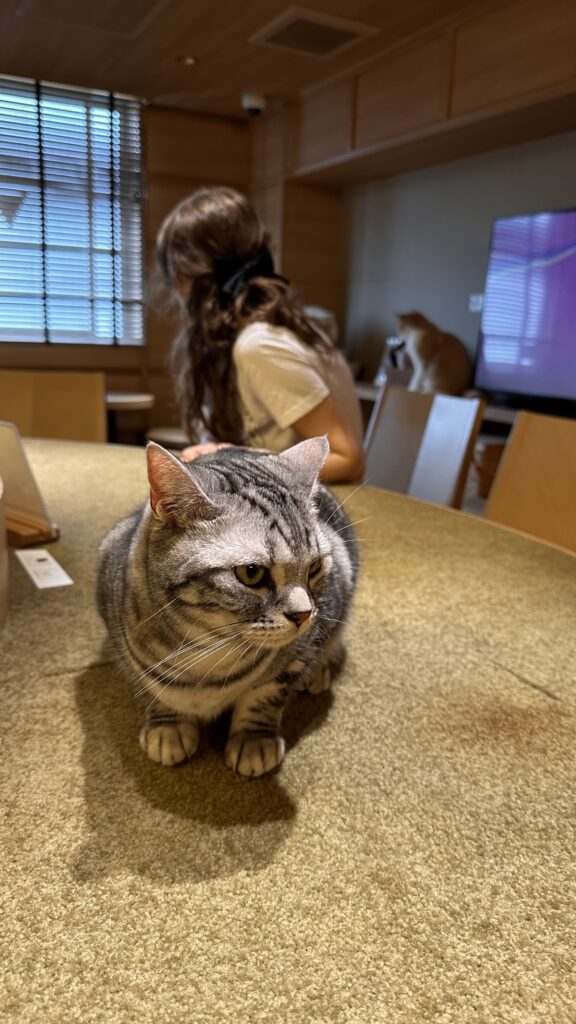 Heute ging es für uns zur nächsten Station unserer Reise: Kyoto. Doch zuvor haben wir die Zeit genutzt und einen weiteren Punkt von der Bucket-Liste entfernt. Auch ohne den Titel gelesen zu haben, wisst ihr bestimmt, welcher Punkt bei Alona immer auf der Liste steht, egal auf welcher. Daher nutzen wir die Zeit vor der Abfahrt für den Besuch im Cat Café Mocha Lounge in Shinjuku. Überpünktlich – also kurz vor der morgendlichen Fütterung waren wir dort und haben uns mit den vielen verschiedenen Katzen vor Ort bekannt gemacht. Die waren sehr zahlreich, hatten aber alle den fixen Blick auf die Personaltüre, durch welche wenige Zeit später das Futter gebracht wurde. Trotzdem konnten wir in unserer Zeit im Café den ein oder anderen Vierbeiner für eine Streicheleinheit oder ein kurzes Spiel gewinnen. Zum Abschluss gab es wieder einen Stempel für unsere Sammlung. ^_^