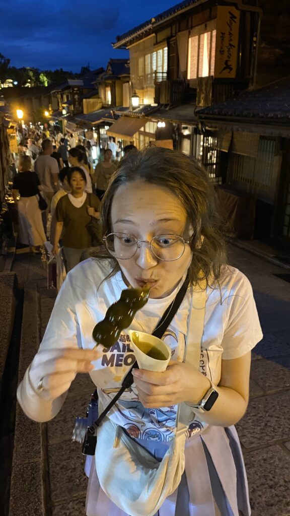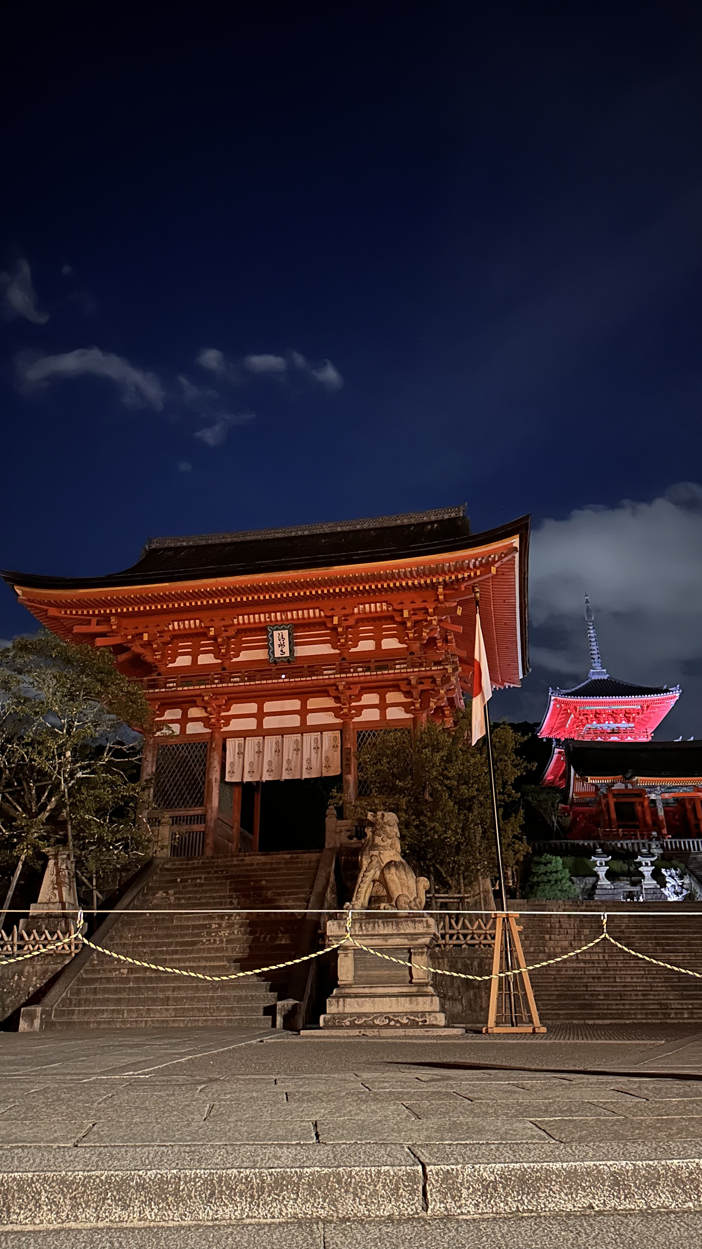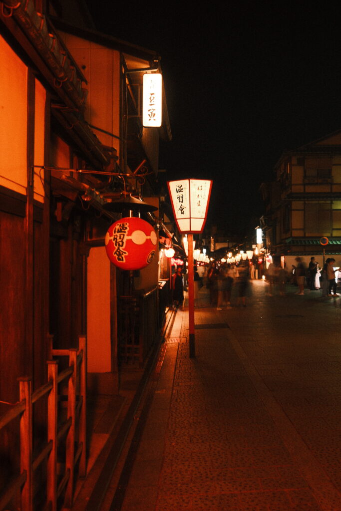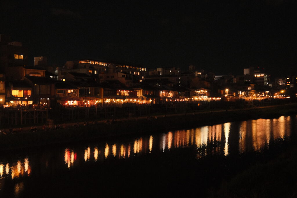 Angekommen in Kyoto haben wir nur schnell unsere Koffer in die Unterkunft gebracht und sind im Anschluss durch die Stadt in Richtung Ninen-zaka geschlendert. Auf dem Weg dorthin kamen uns bereits massenhaft Touristen entgegen, denn wir kamen leider erst nach Einbruch der Dämmerung dort an. Da dort jeder Laden scheinbar um 18 Uhr die Pforten schließt, waren kaum noch Menschen vor Ort. So genossen wir den Spaziergang durch dieses historische Stadtviertel im Licht der Straßenlaternen und Lampions. Zum Abschluss ging es noch am Fluss und durch die Pontocho-Gasse, eine historische Gourmet-Straße, zurück zur Unterkunft.