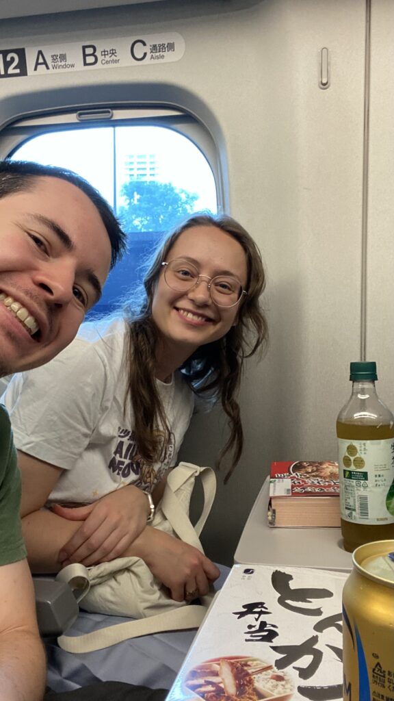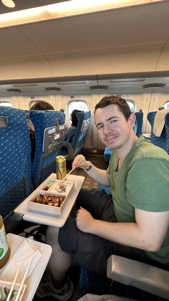 Mit Gepäck beladen hieß es nun wirklich: Auf nach Kyoto! Am Bahnhof Shinjuku dann die erste Verwunderung: JR (Japan Railways) hatte Verspätung! Ganze 7 Minuten! Die Lautsprechanlage wollte nicht Ruhe geben und eine Dame bat höflichst um Entschuldigung – es gab wohl einen Notfall im Zug. Mit dieser ungeplanten Verspätung war es gut, dass wir noch gar keine Tickets für die Fahrt gekauft hatten und uns somit keinen Stress machen mussten. Mit schlussendlich fünf Minuten Verzögerung am Hauptbahnhof Tokyo angekommen, konnten wir unsere Tickets holen. Leider konnte uns der freundliche Bahnmitarbeiter keine Sitzplätze am Fenster für den nächsten Shinkansen nach Kyoto um 14:09 Uhr anbieten, also entschieden wir uns für den nächsten Schnellzug um 14:12 Uhr (:D). Auf dem Weg zum Gleis noch schnell zwei Bento mitgenommen und los ging die knapp zwei Stunden dauernde Fahrt mit dem Nozomi Tokaido Shinkansen.