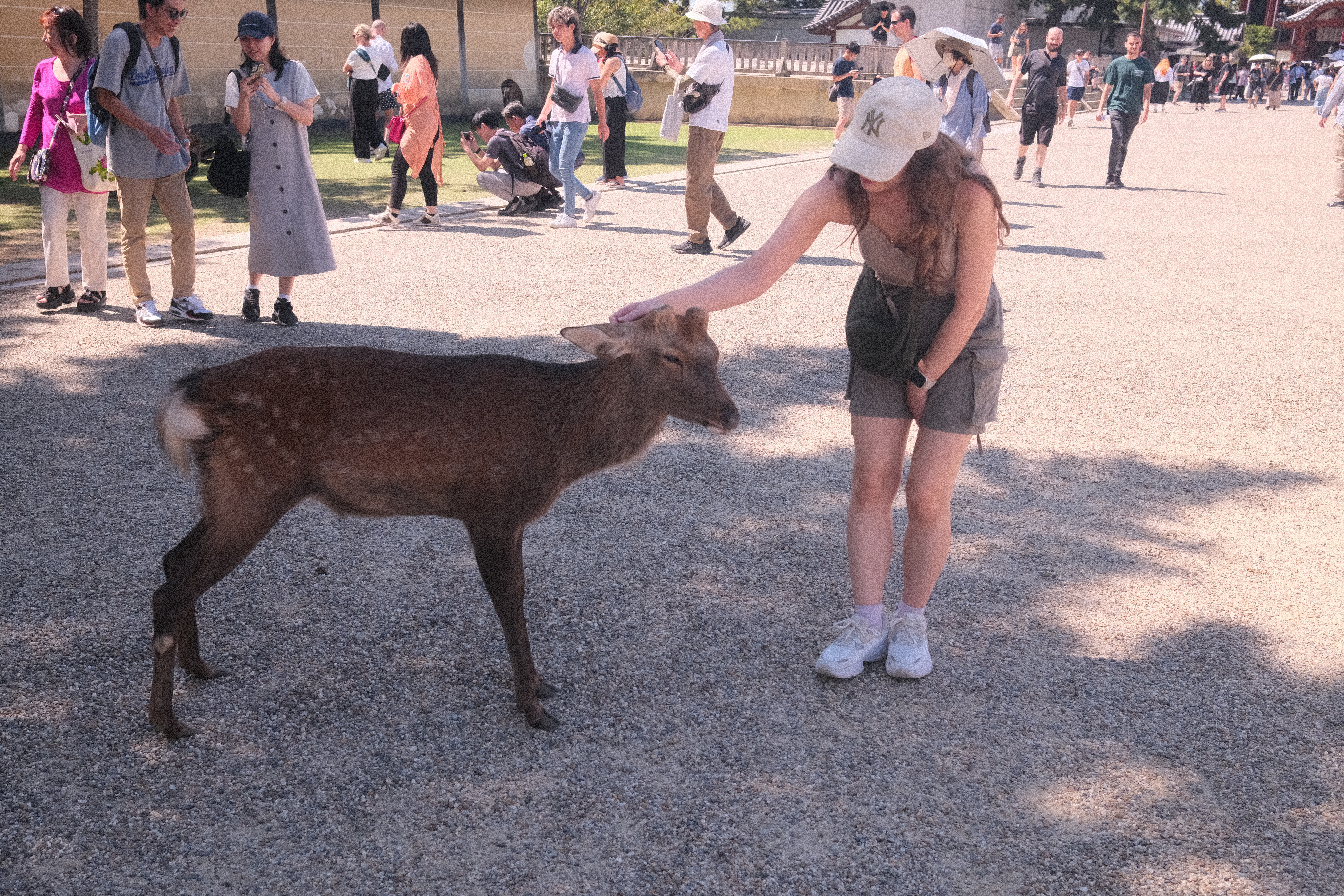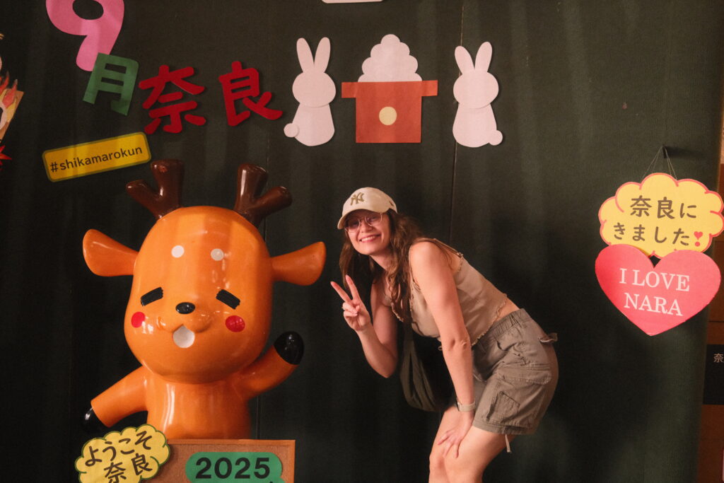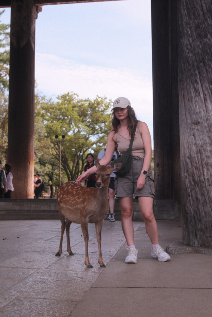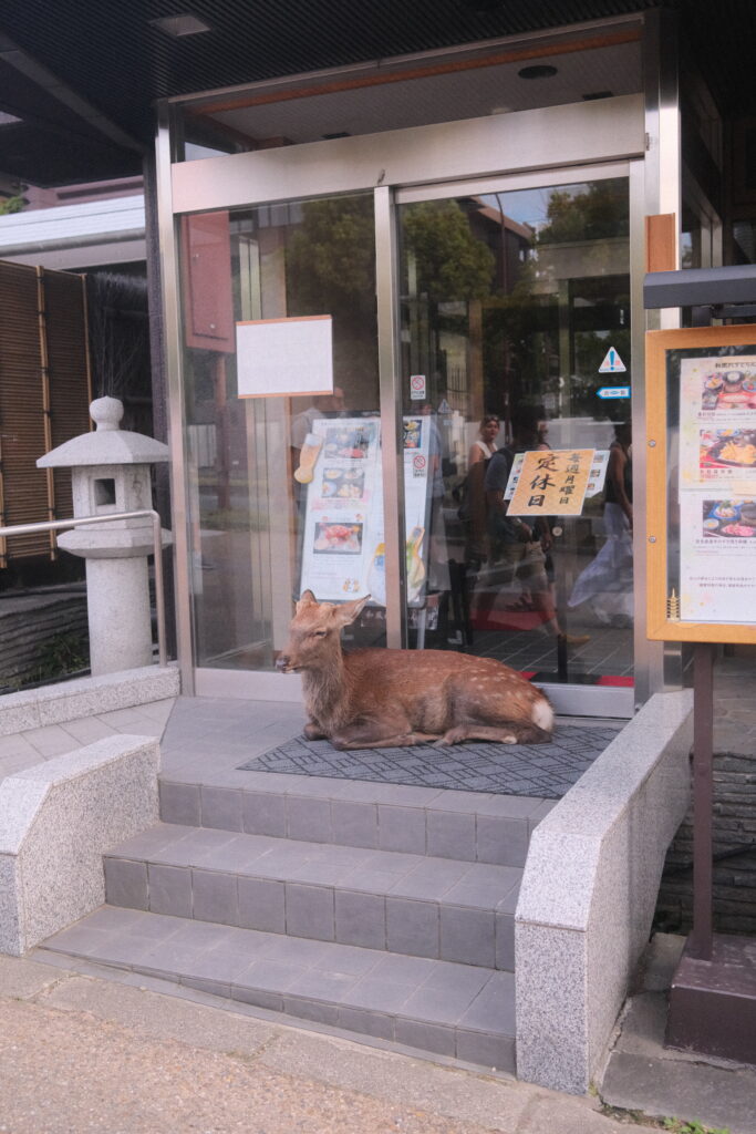Eine dreiviertel Stunde Zugfahrt mit ununterbrochen quasselnden Schwaben nebenan später kamen wir in der Stadt Nara an, die bekannt für die vielen freilaufenden Rehe ist – oder korrekterweise: Sika-Hirsche. Aber wer ist schon korrekt. Übrigens war Nara einst vor Tokyo und Kyoto die Hauptstadt Japans.