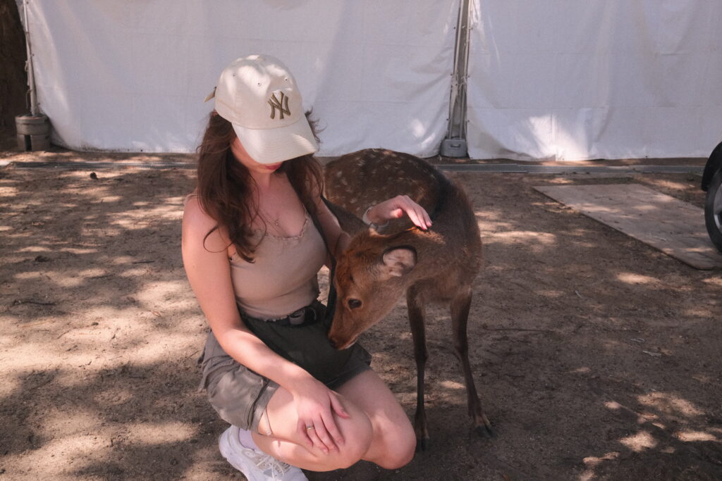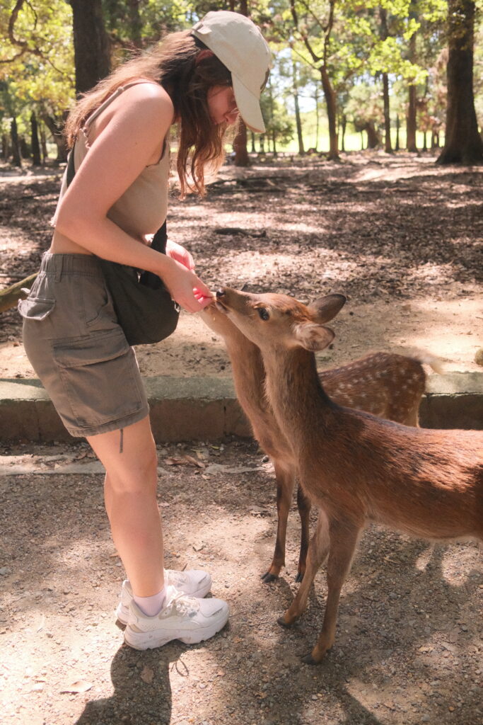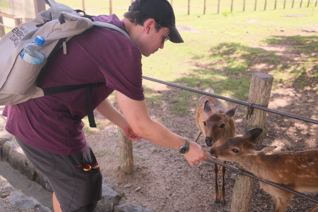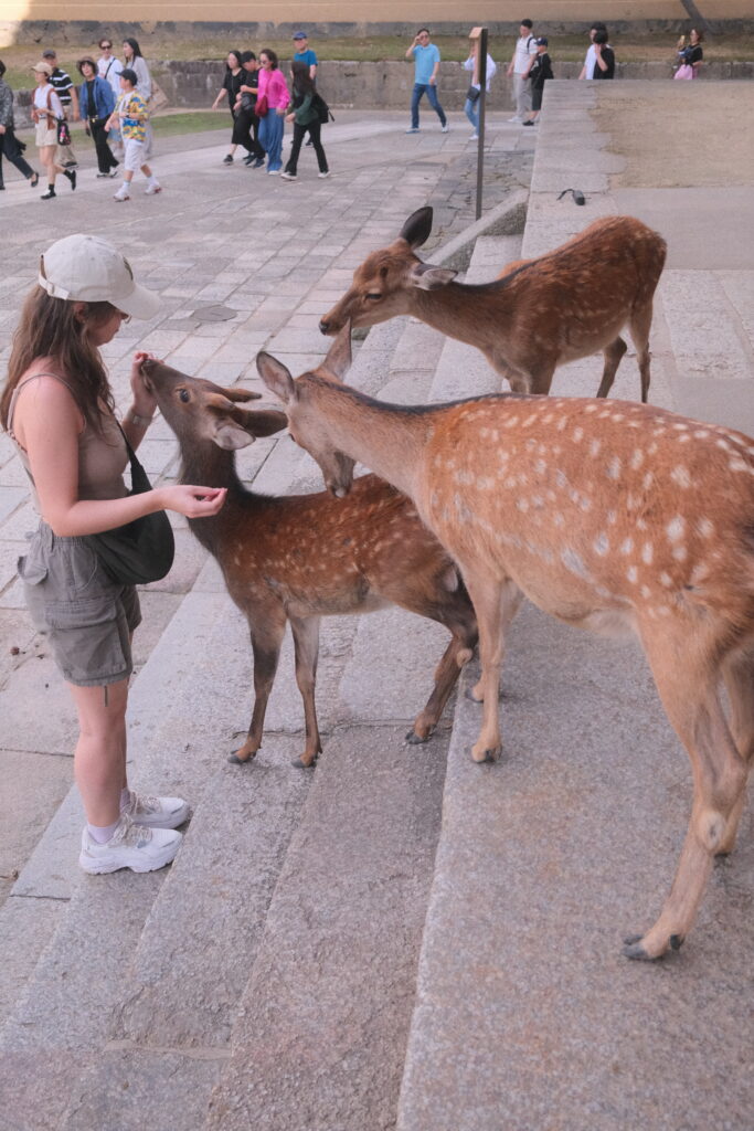 Vor Ort gab es natürlich ein Must Do: Rehe streicheln und füttern! Kaum aus dem Bahnhof raus und ein paar Meter Richtung Park sahen wir schon die ersten Tiere – auf dem Spazierweg die Leute anstupsend, auf Grünflächen schlafend oder sogar in Hauseingängen liegend. Schön zu sehen war für uns auf jeden Fall, dass die Tiere nicht massiv durch die Touristen bedrängt werden – es ist eher anders rum 😀 Lucas musste es direkt spüren: Ein forderndes Reh verfolgte ihn und verfing sich mit seinen Hörnern in seiner Hose, bis wir ihm den schmackhaften Haferkeks gegeben haben. Diese werden dort überall extra als Futter für die Tiere verkauft. Überall liefen Rehe in so einem großen Areal herum – es war wirklich süß! 🙂