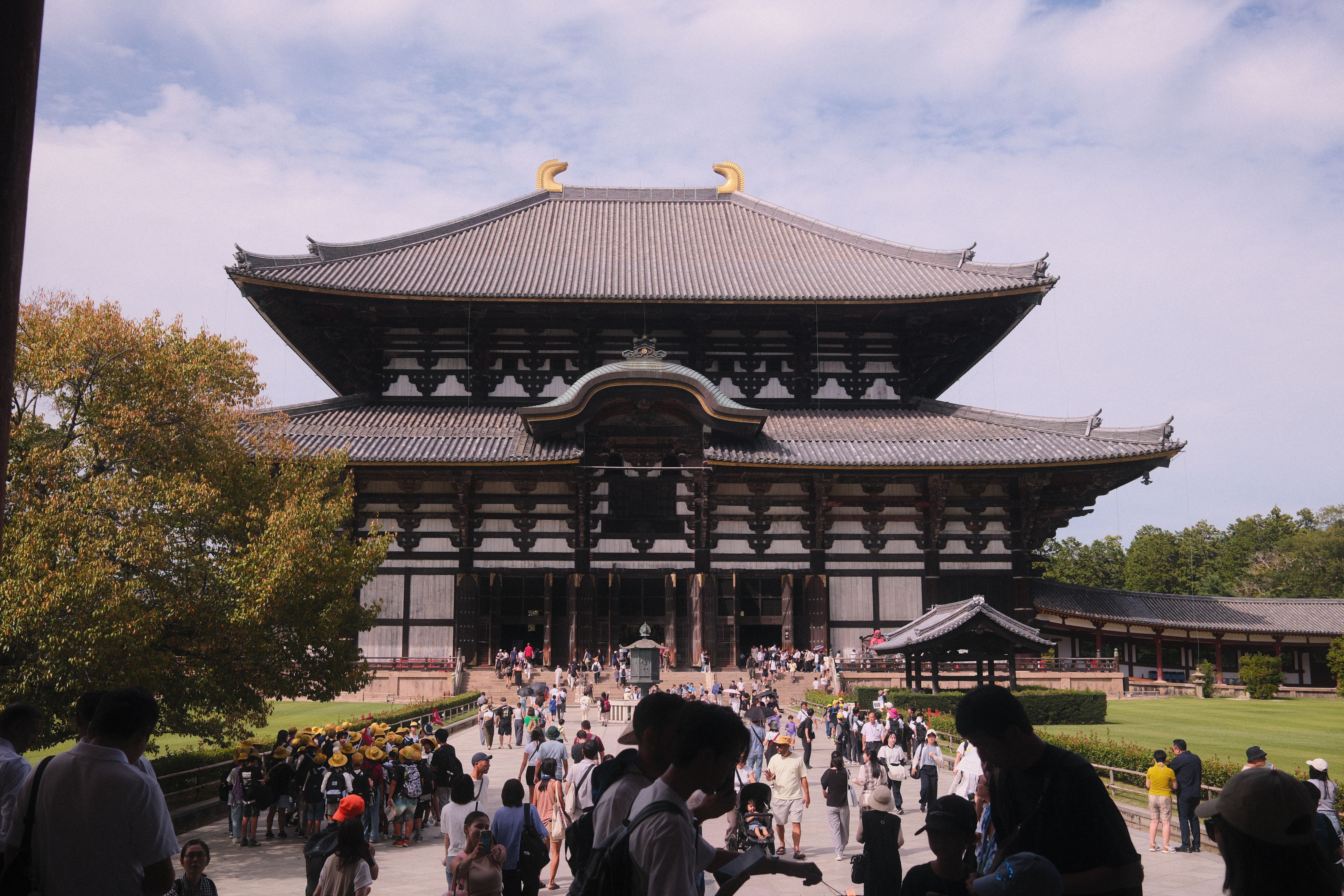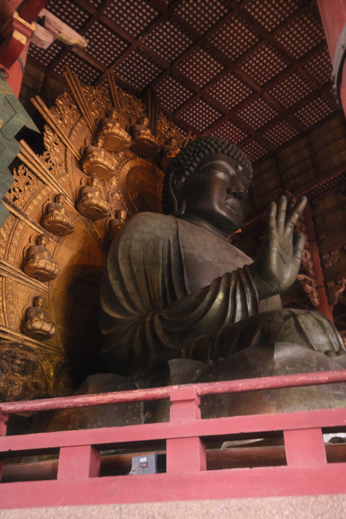 Zusätzlich zu den Rehen gibt es im Park einen botanischen Garten und zahlreiche Tempel – darunter einen besonders großen, den Todai-ji Tempel. Nachdem wir in den letzten Tagen einige Tempel gesehen haben, können wir bestätigen: dieser ist wirklich groß und nebenbei auch das größte rein aus Holz gebaute Gebäude der Welt. Darin befindet sich außerdem die größte buddhistische Bronzestatue. Schon beeindruckend.